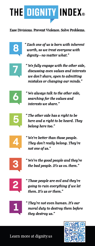 Communication and discourse that is rooted in contempt, rather than dignity, can result in dehumanization and political violence. “One thing that the Dignity Index rightly points out is that the more you start to dehumanize your opponent or people you disagree with, the more your society starts to trend toward consequences like violence,” explains Caliger. “That is where the road ends when societies dehumanize others to the point of removing rights or devaluing the lives of people with whom they disagree or whom they see as ‘other.'”